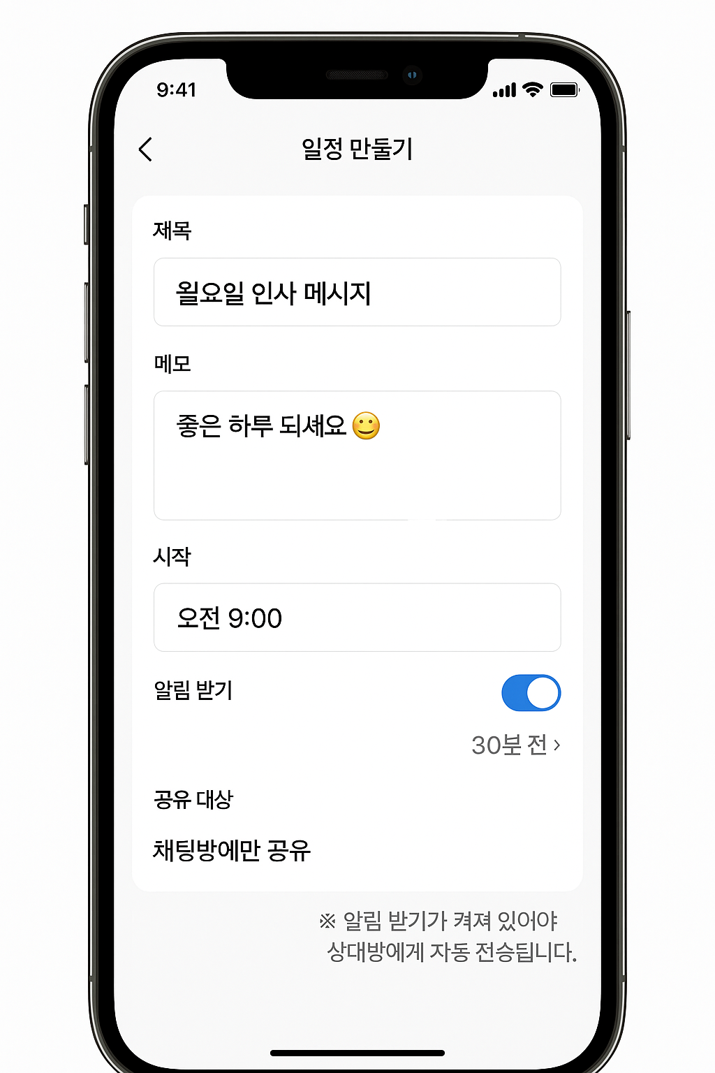 💡 알림 설정을 반드시 켜야 메시지가 자동 전송됩니다.